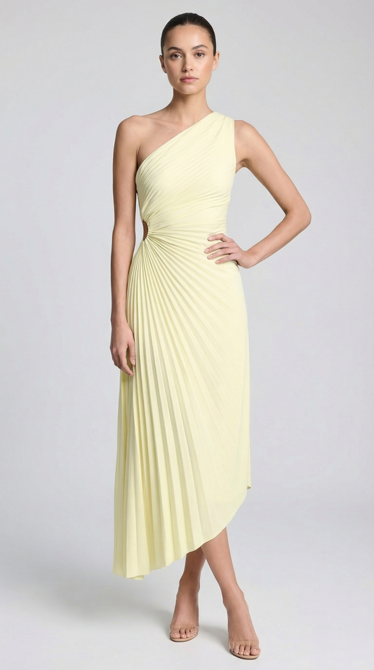 Lemon One-Shoulder Pleated Asymmetric Midi Party Dress