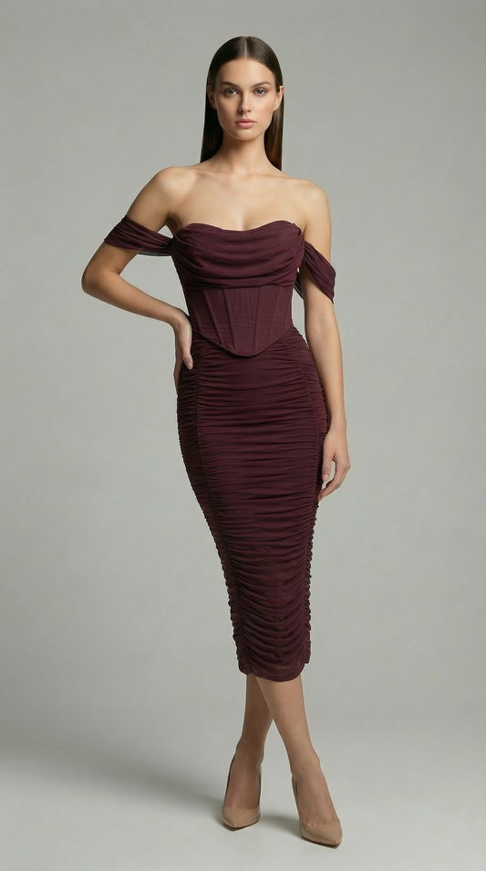Off-The-Shoulder Ruched Corset Midi Dress – Elegant Bodycon Cocktail Dress