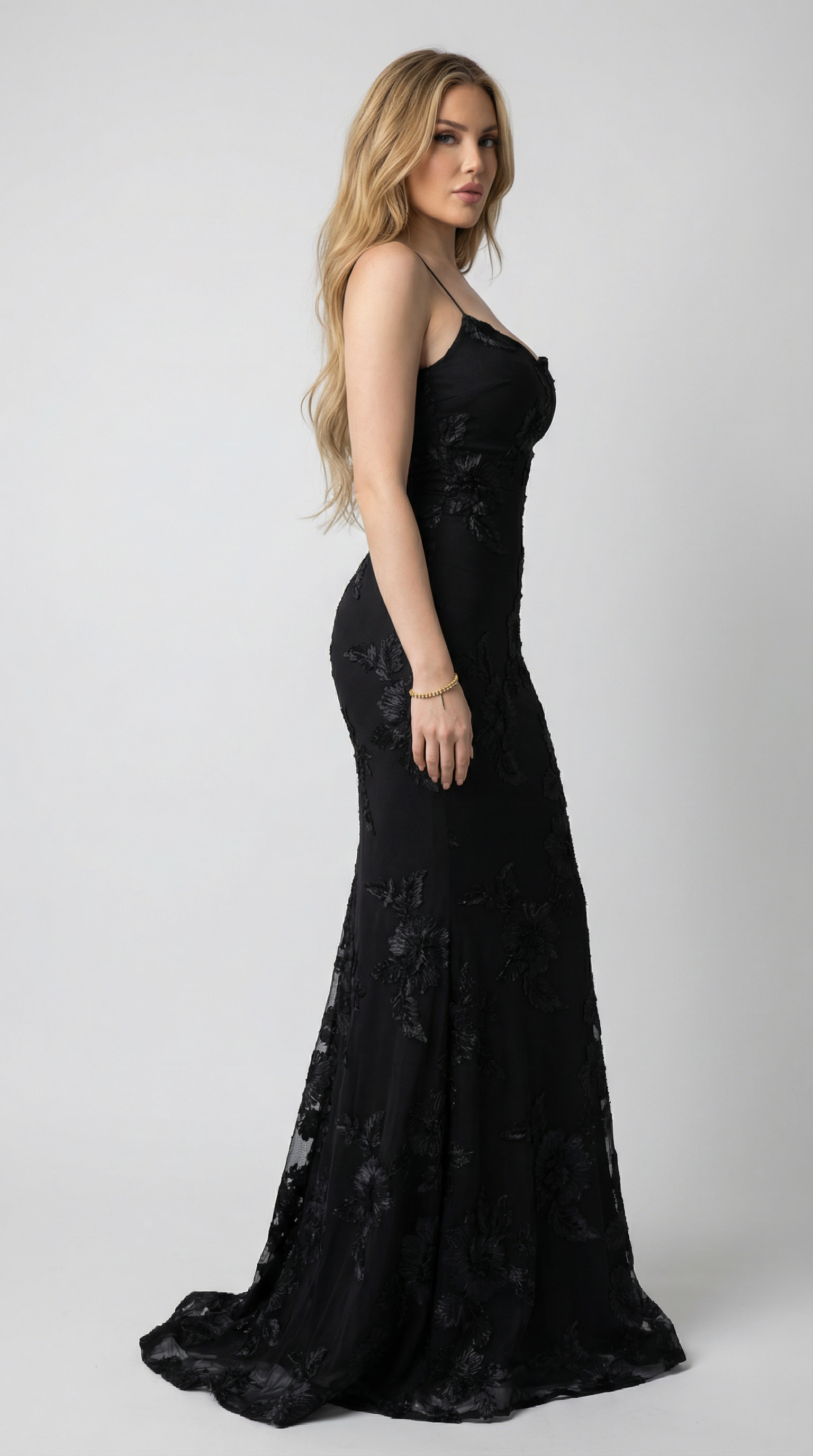 The Black Floral Embroidered Mesh Mermaid Maxi Evening Dress is a timeless, elegant gown designed for formal occasions. Crafted from sheer mesh fabric with delicate floral embroidery, this dress creates a refined, romantic look while subtly highlighting the silhouette. The slim-fit bodice flows into a graceful mermaid-style skirt, enhancing curves and adding dramatic movement. Finished with a sleek, minimalist neckline and a sophisticated backless feel, it’s perfect for evening parties, weddings, and formal events.