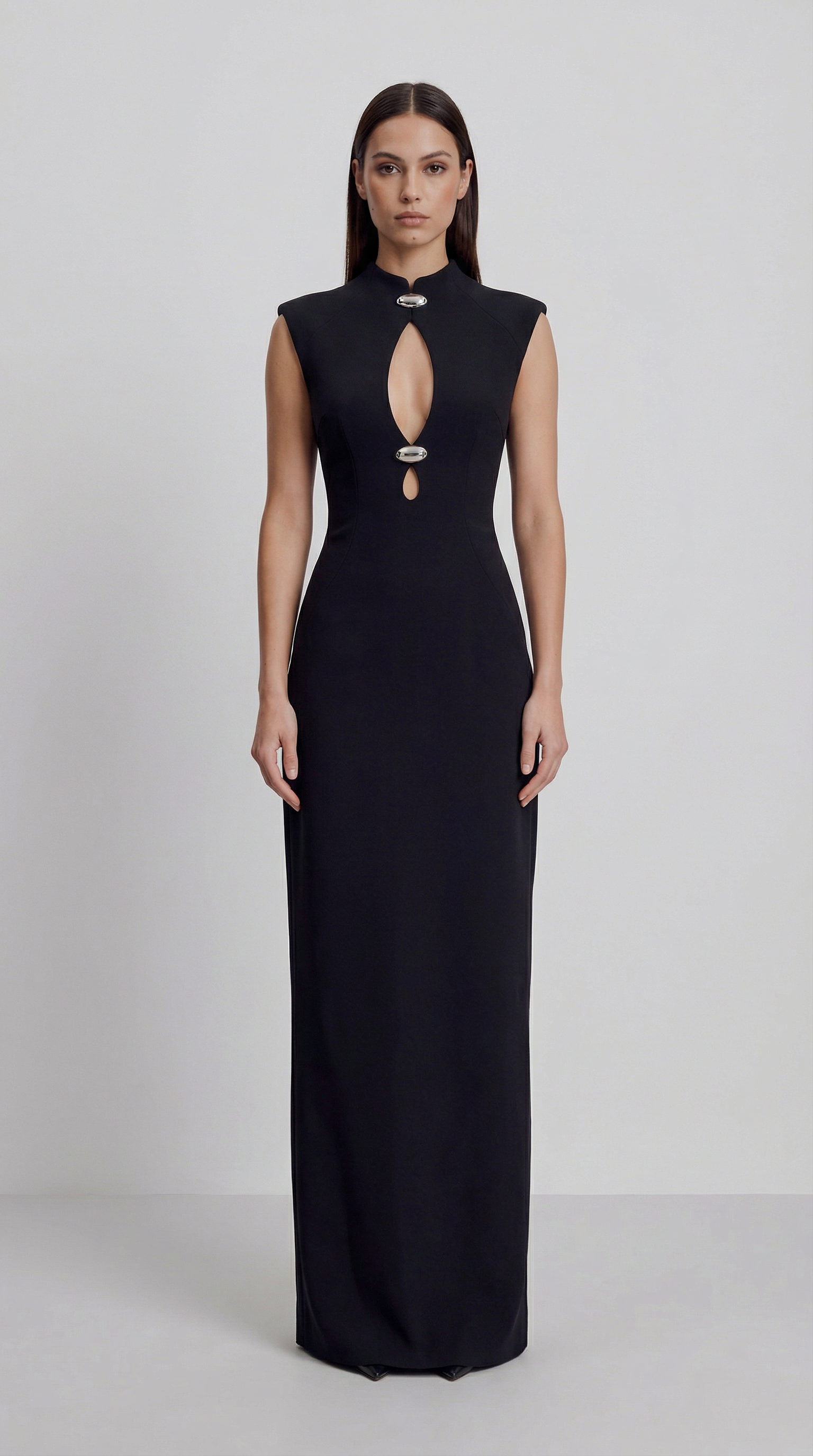 The Black High-Neck Cutout Bodycon Maxi Evening Dress is a sleek, luxury-inspired piece designed for bold elegance. Featuring a modern high neckline with statement front cutouts, this dress creates a refined yet sexy look that instantly stands out. The structured, body-hugging silhouette smooths and flatters the figure, while the minimalist maxi length keeps the style sophisticated and timeless. Finished with chic metallic accents at the cutout, it’s perfect for parties, cocktail nights, formal dinners, and upscale events.