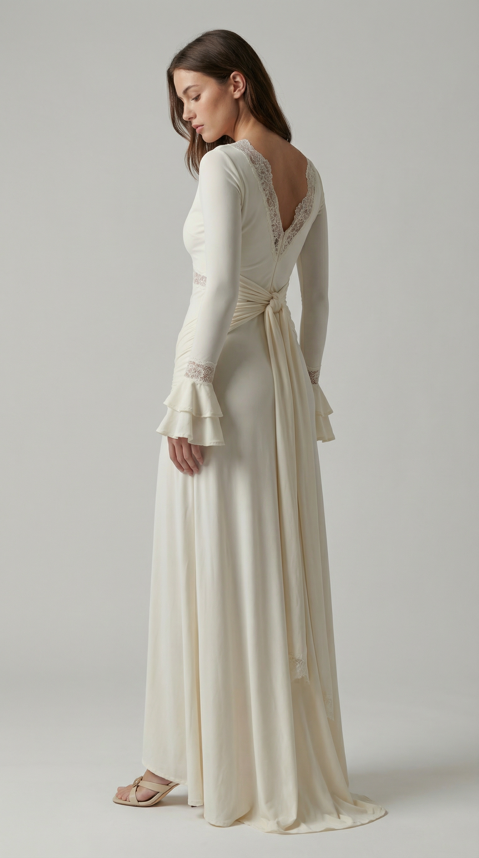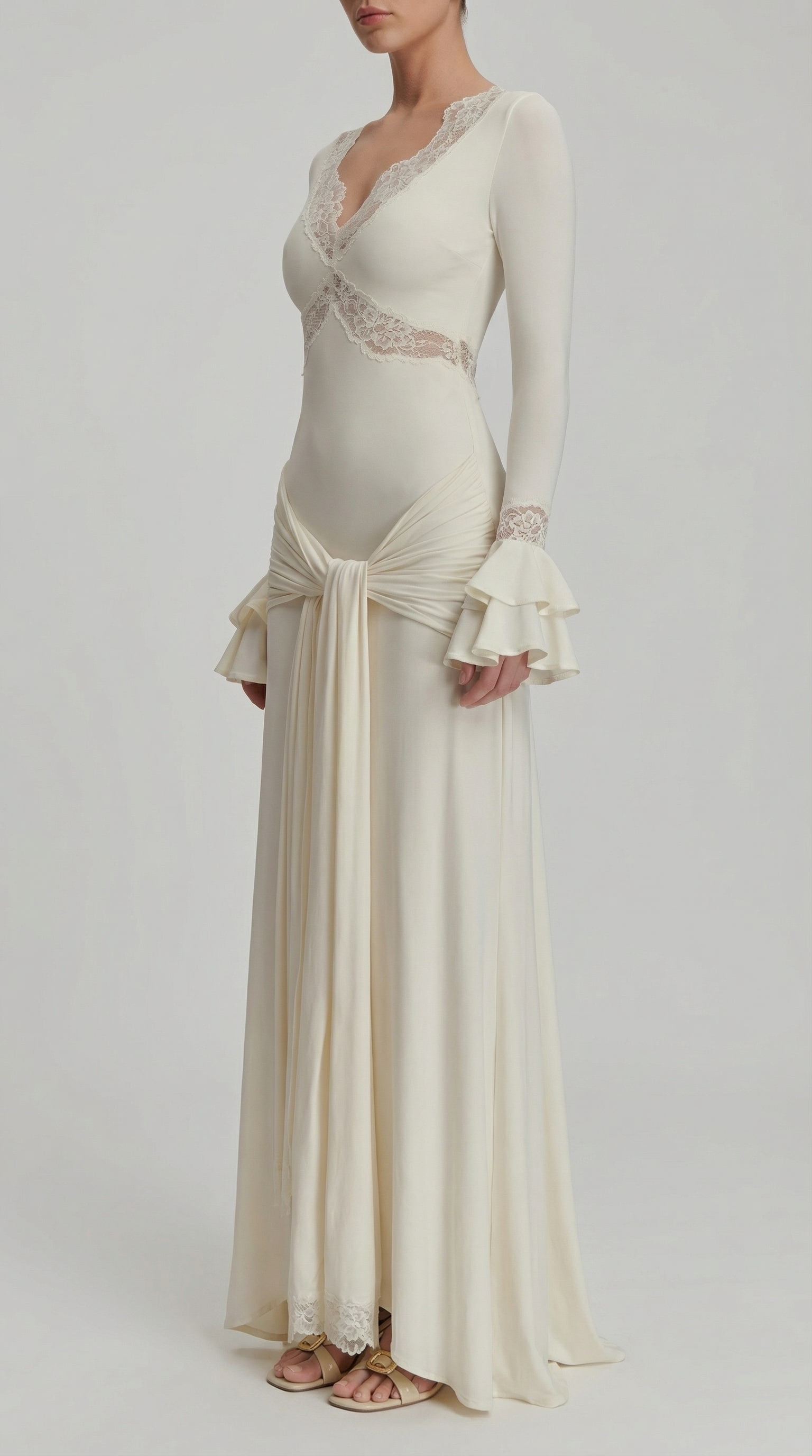 The Elegant Deep V Lace Cutout Backless Long Sleeve Maxi Dress is a refined statement piece made for evening glamour. Designed in a soft, figure-skimming fabric, this gown features a plunging V-neckline framed with delicate lace, plus lace patchwork cutout detailing that adds a romantic, elevated touch. The long sleeves with flared cuffs bring a graceful silhouette, while the open-back (backless) design creates a stunning finish for parties, dinners, and special occasions.