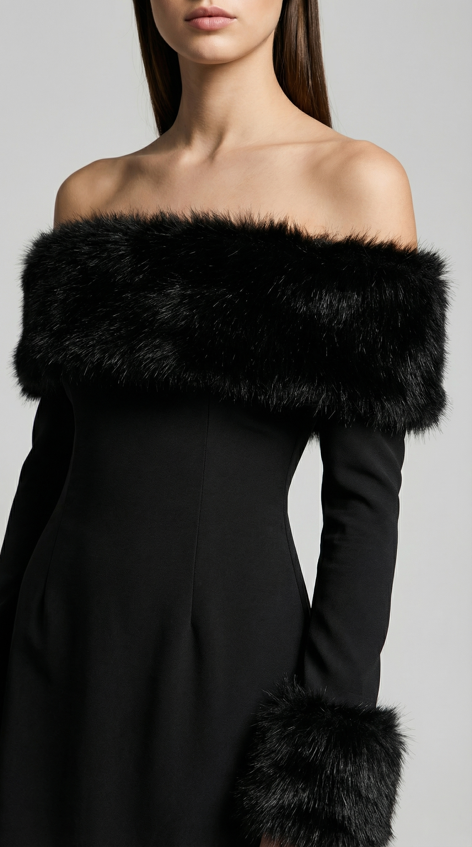 This off-shoulder mini dress is ideal for cocktail parties, night events, and holiday gatherings. Pair it with classic black or metallic heels for an elegant look, and add a clutch to complete the ensemble. Minimal jewelry works best to keep the focus on the striking neckline and luxurious fur detailing.