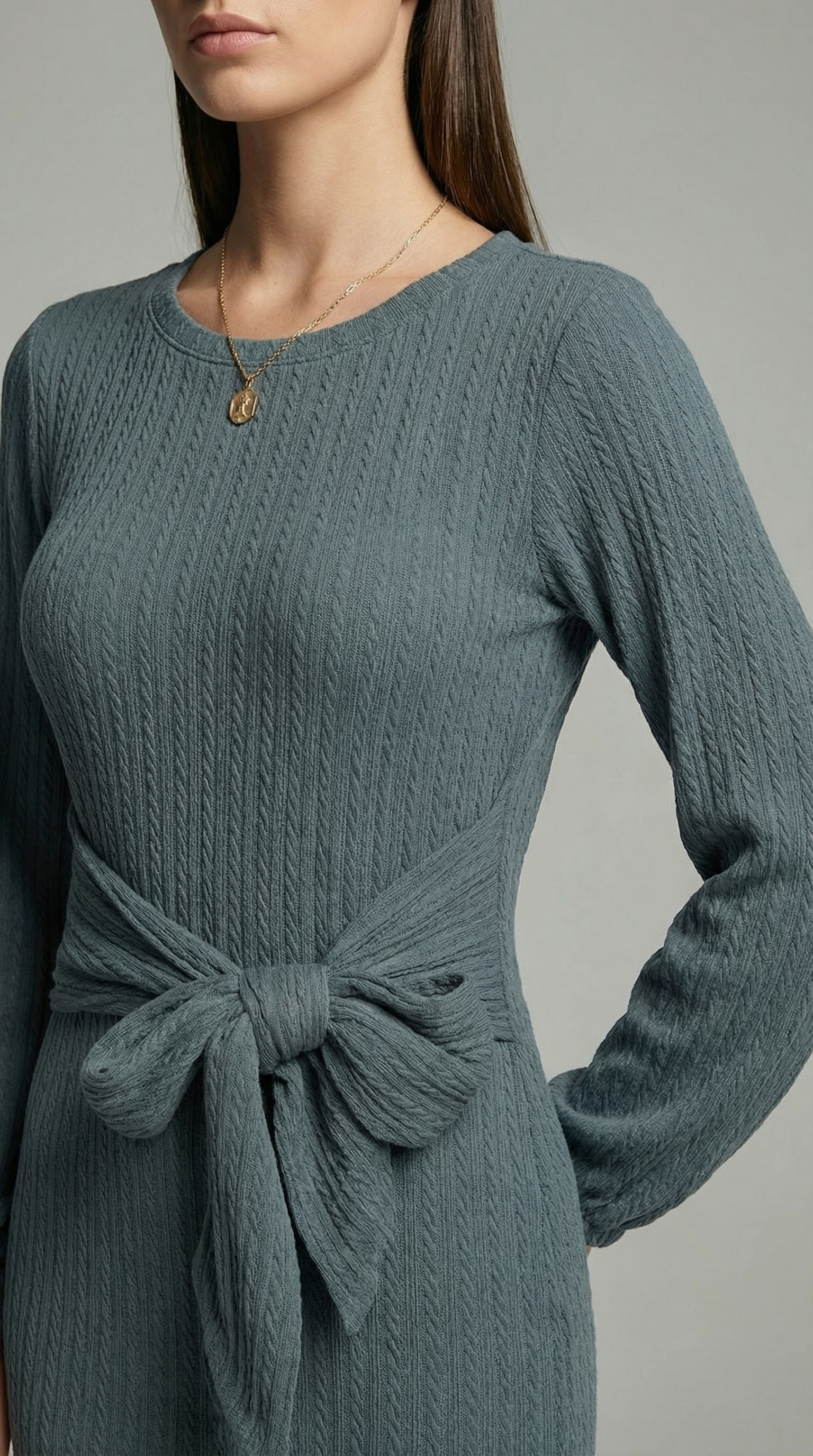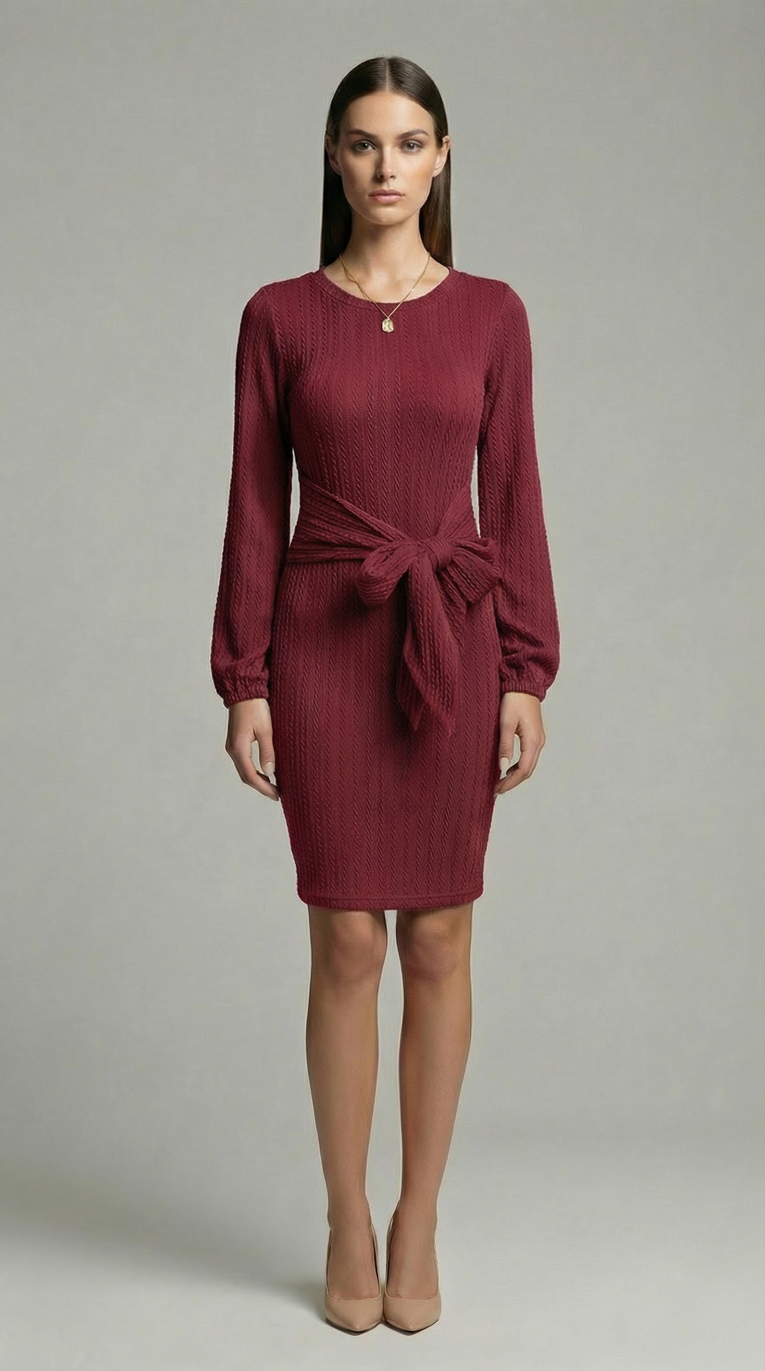 Elegant Ribbed Knit Bodycon Dress with Tie Waist – Long Sleeve Minimalist Sweater Dress