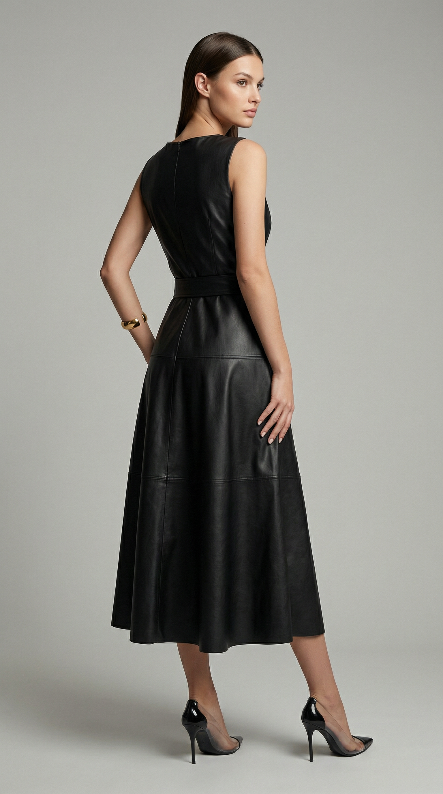 Elegant Sleeveless PU Leather A-Line Midi Dress with Zip Back & Pleated Design