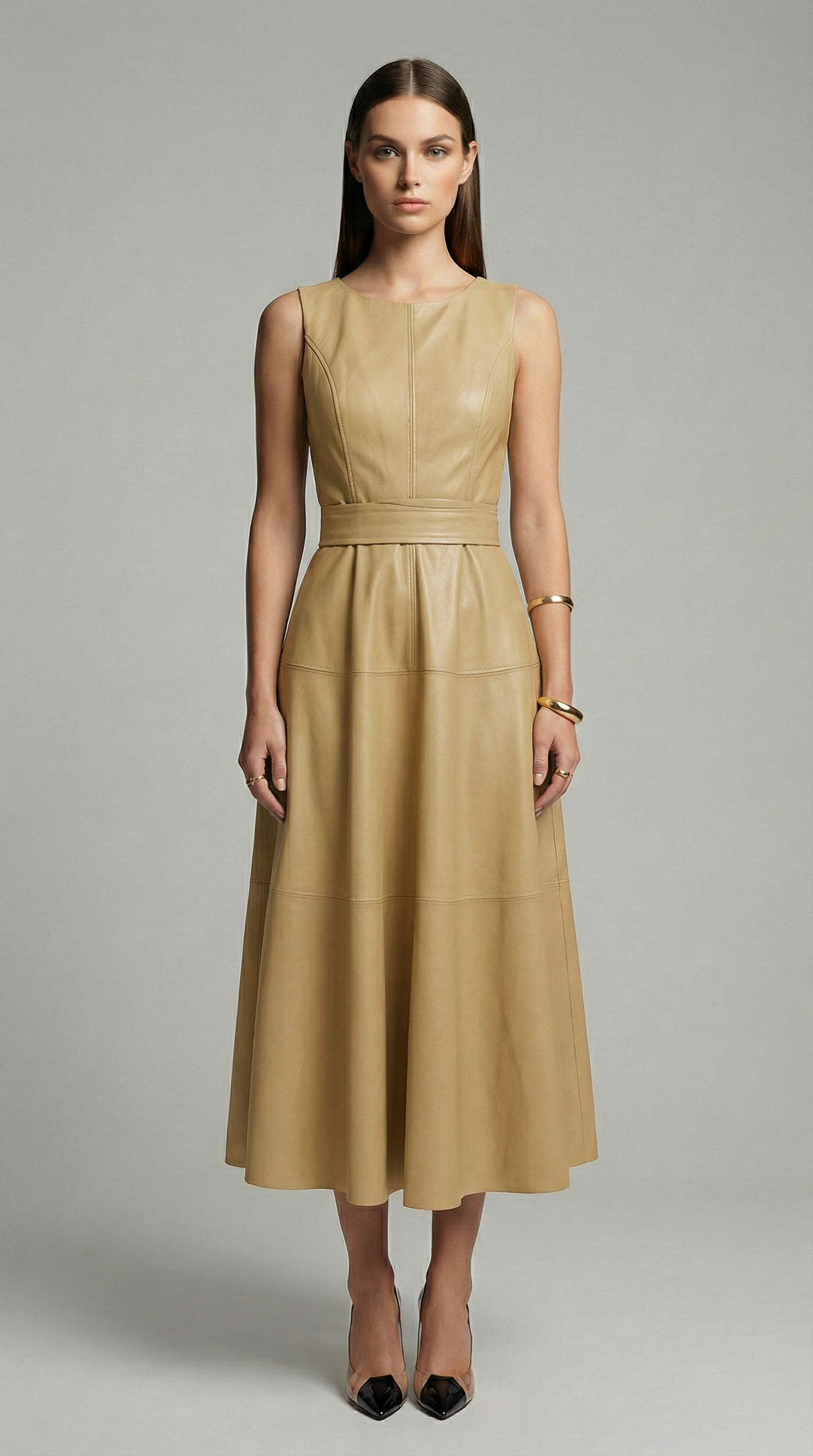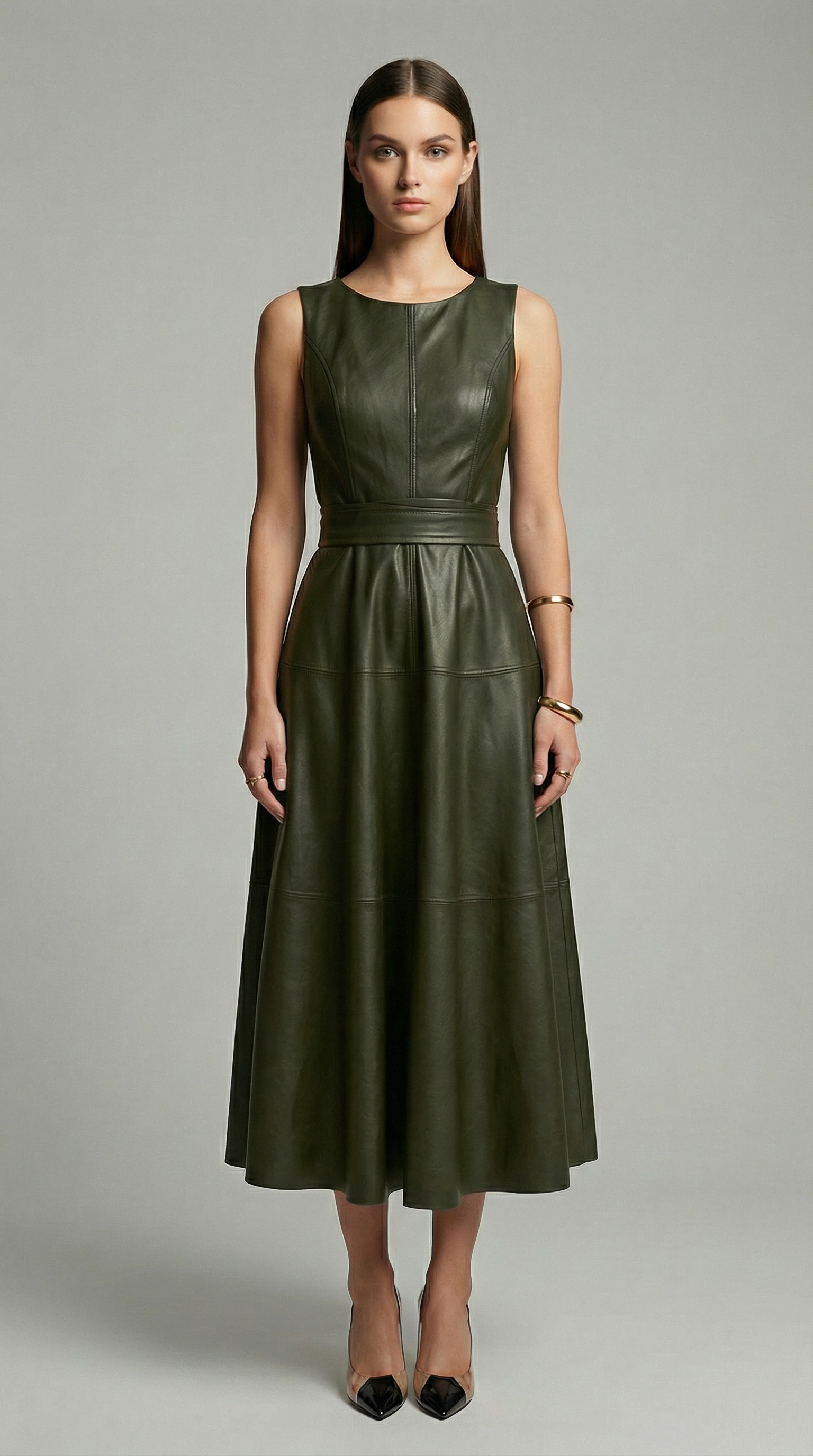 This Sleeveless PU Leather A-Line Midi Dress delivers a perfect balance of modern sophistication and timeless elegance. Crafted from high-quality PU leather, the dress features a smooth, structured finish that holds its shape while remaining comfortable to wear.