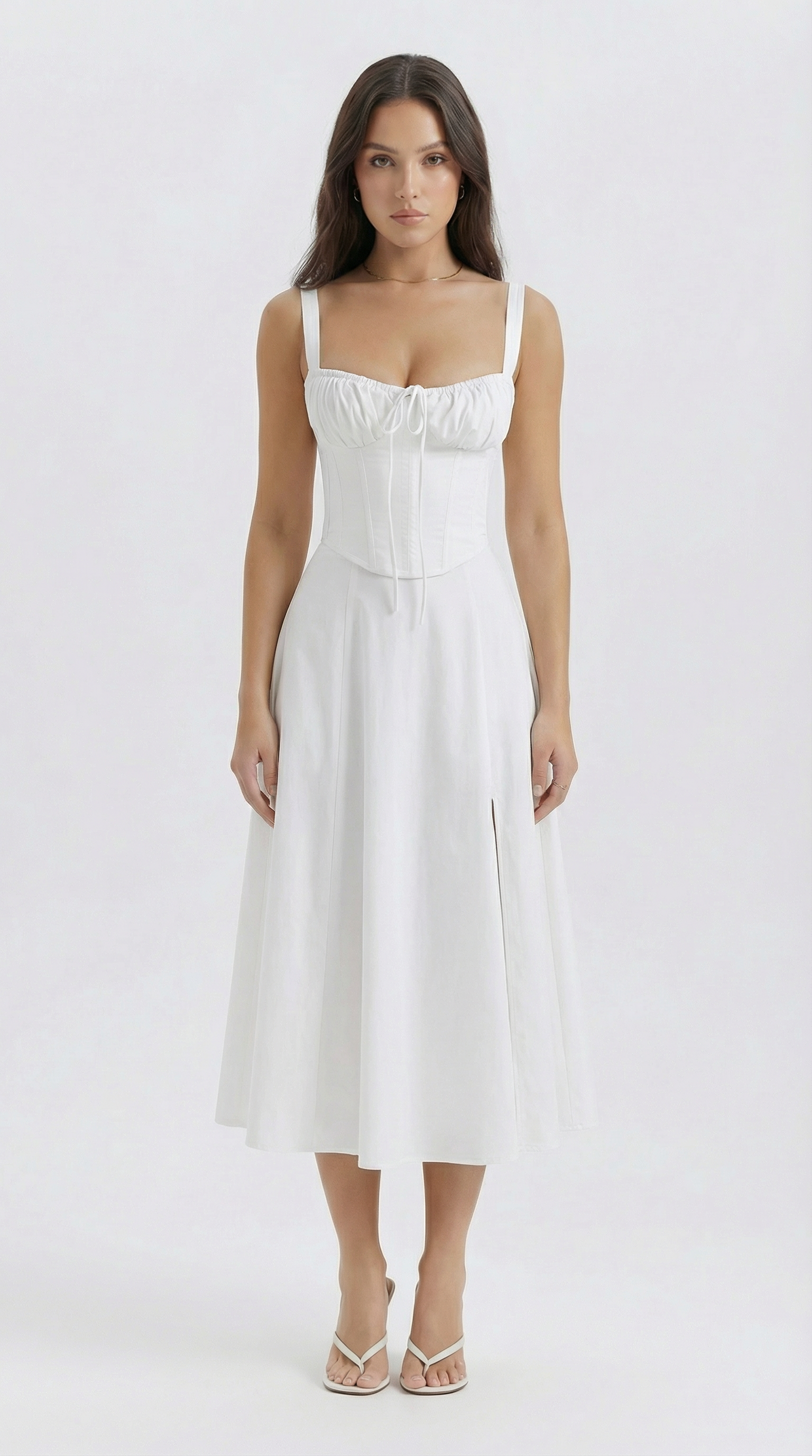 The Black Lace-Up Corset Spaghetti Strap A-Line Midi Dress is a refined yet alluring piece designed for effortless elegance. Featuring a structured corset-style bodice with a lace-up front detail, this dress cinches the waist beautifully while offering a flattering, supportive fit. Delicate spaghetti straps and a softly gathered bust add a feminine touch, while the fully lined A-line midi skirt flows gracefully for comfortable movement. A subtle side slit enhances ease and allure—perfect for holidays, parties, and summer events.