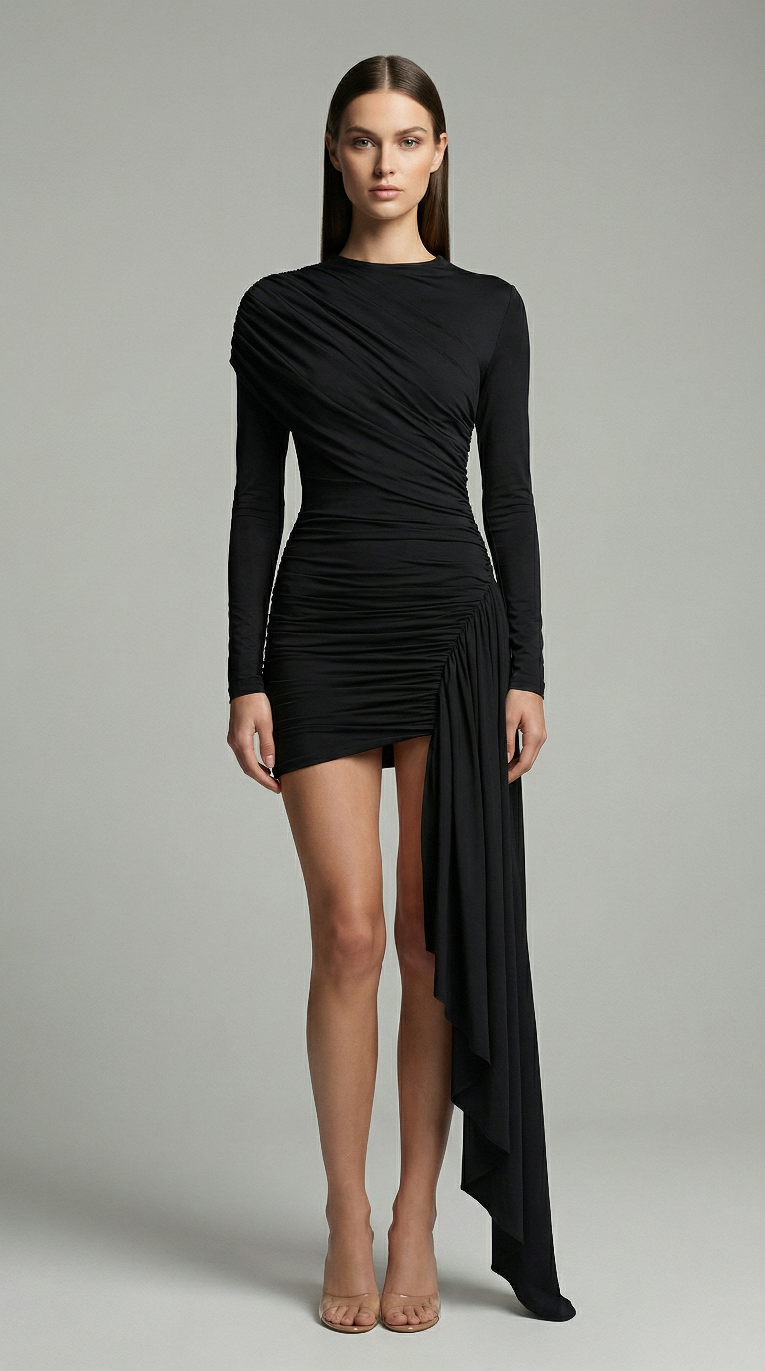 The Long Sleeve Pleated Backless Mini Party Dress / Elegant Long Sleeve Mini Dress is a refined and contemporary piece that blends modern sophistication with subtle sensuality. Designed with a sleek long-sleeve silhouette, this mini dress features elegant pleated detailing that softly drapes across the body, creating a flattering and sculpted look. The backless design adds a striking contrast to the modest front, delivering a balanced and confident aesthetic.