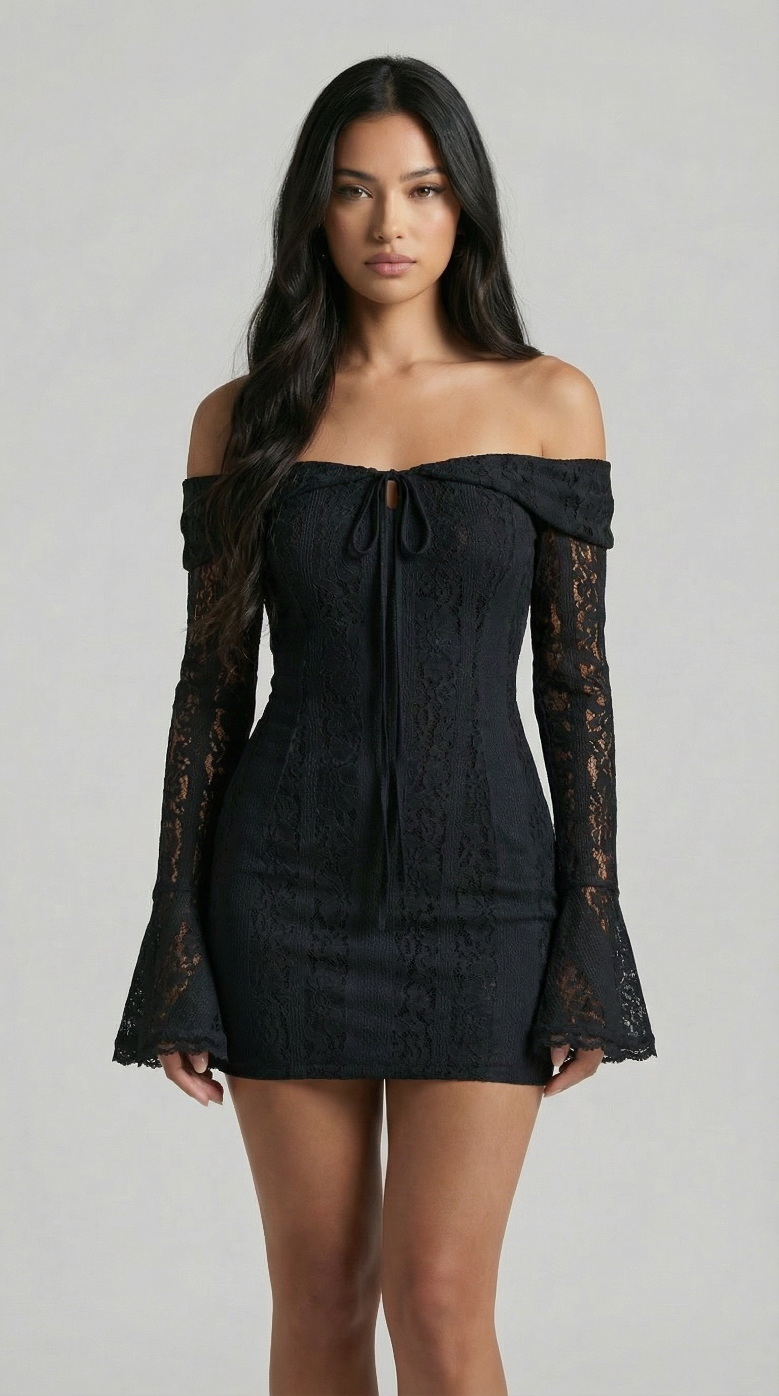 The White Off-Shoulder Lace Mini Dress with Flared Sleeves is a refined yet romantic piece designed for elegant occasions. Featuring a graceful off-the-shoulder neckline, this dress highlights the collarbone and shoulders while creating a soft, feminine silhouette. Crafted from delicate lace with subtle sheer detailing, it hugs the body beautifully for a flattering fit. The long flared sleeves add a touch of vintage-inspired charm, making it perfect for parties, events, and special celebrations.