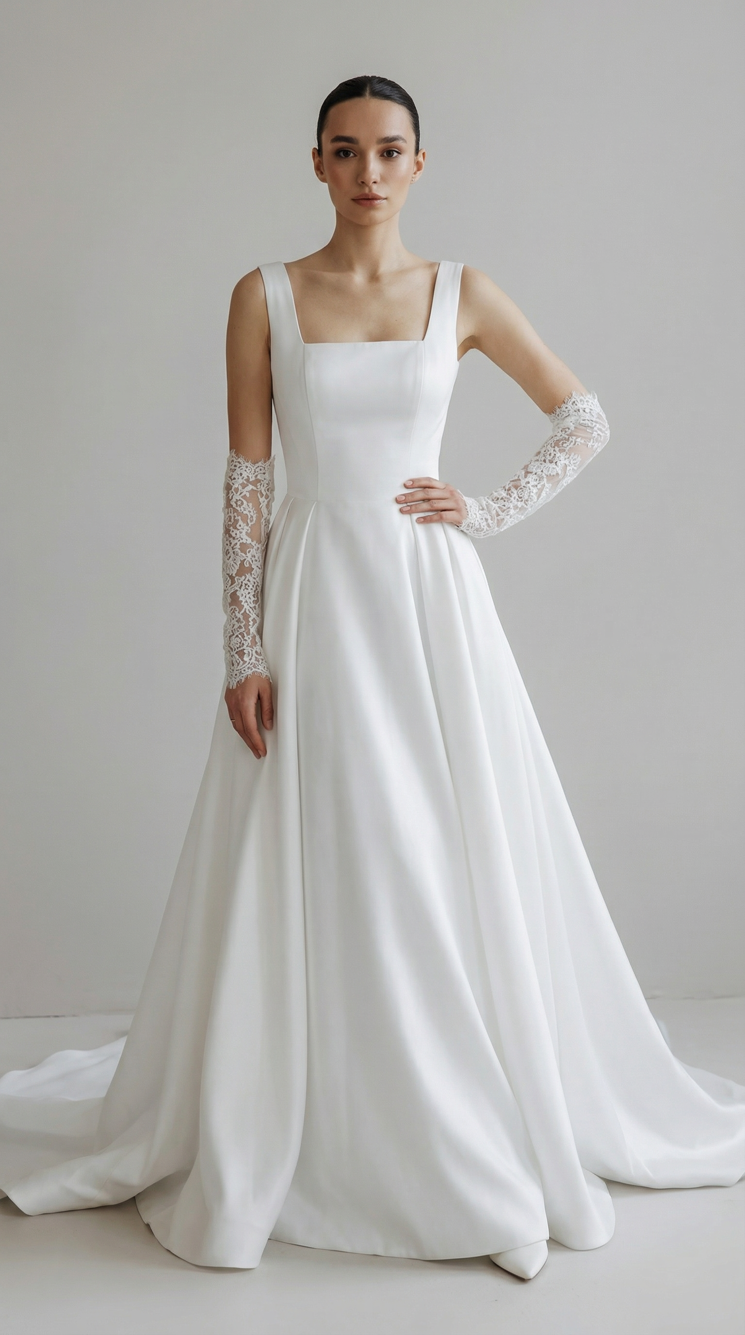 This White Satin A-Line Square Neck Wedding Dress delivers a clean, sophisticated bridal look with a flattering princess silhouette and romantic lace sleeve detailing. Perfect for brides seeking timeless elegance, comfort, and a polished statement on their big day.